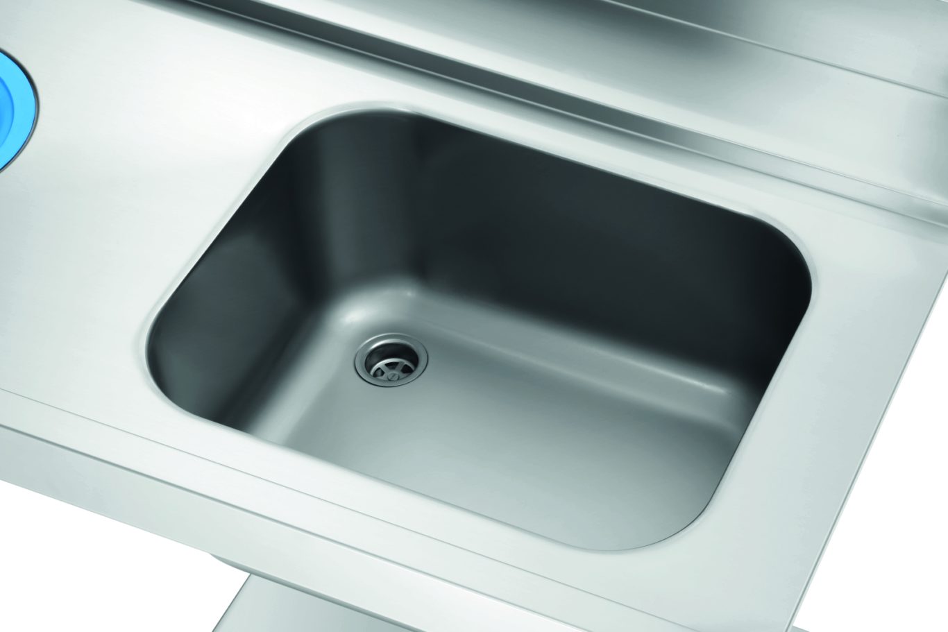 Система предварительной очистки шириной 1,2 м с мойкой и сточной шахтой предназначена для крепления с левой стороны на посудомоечной машине открытого типа Bartscher DS. В основании предусмотрено место для моечных корзин.