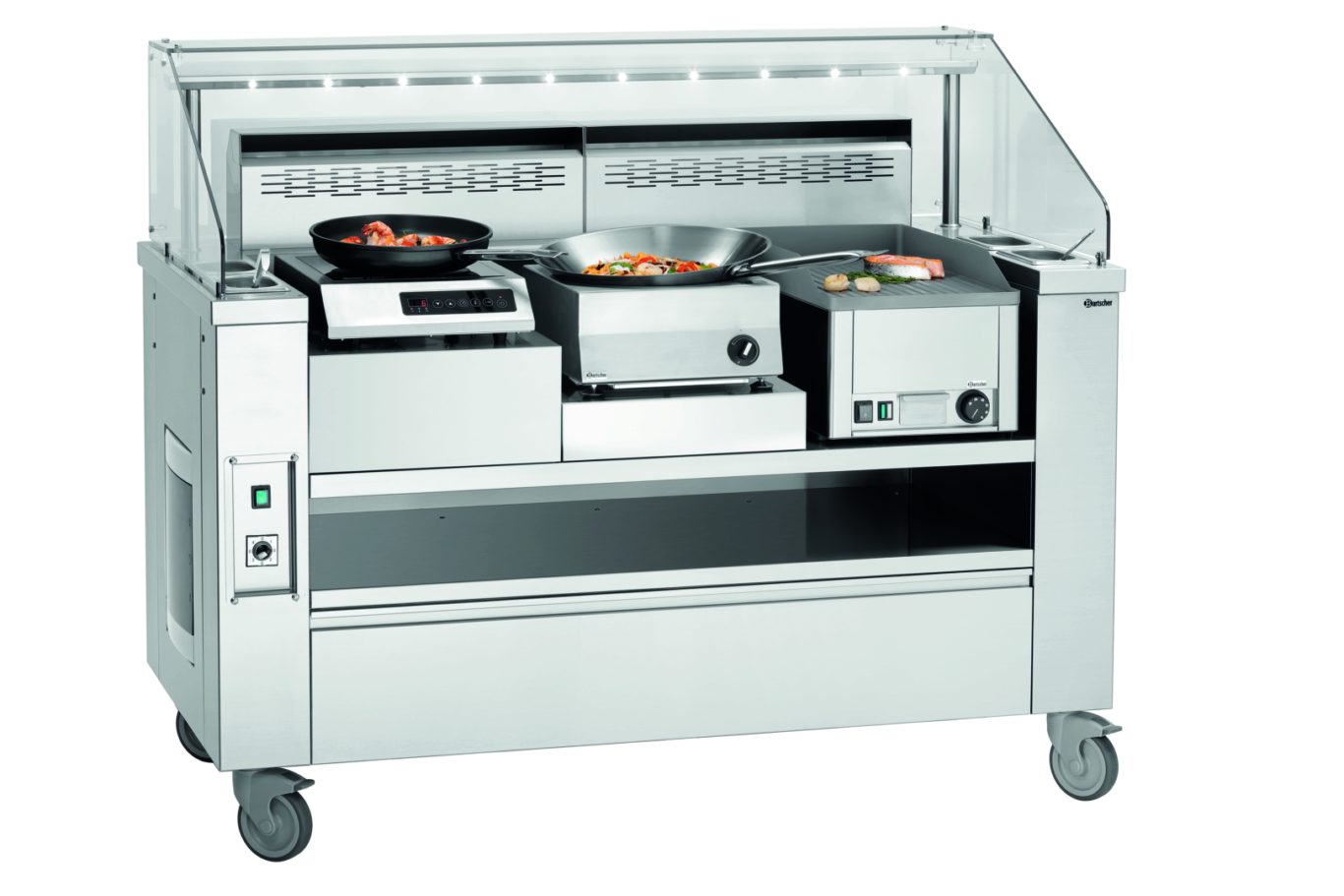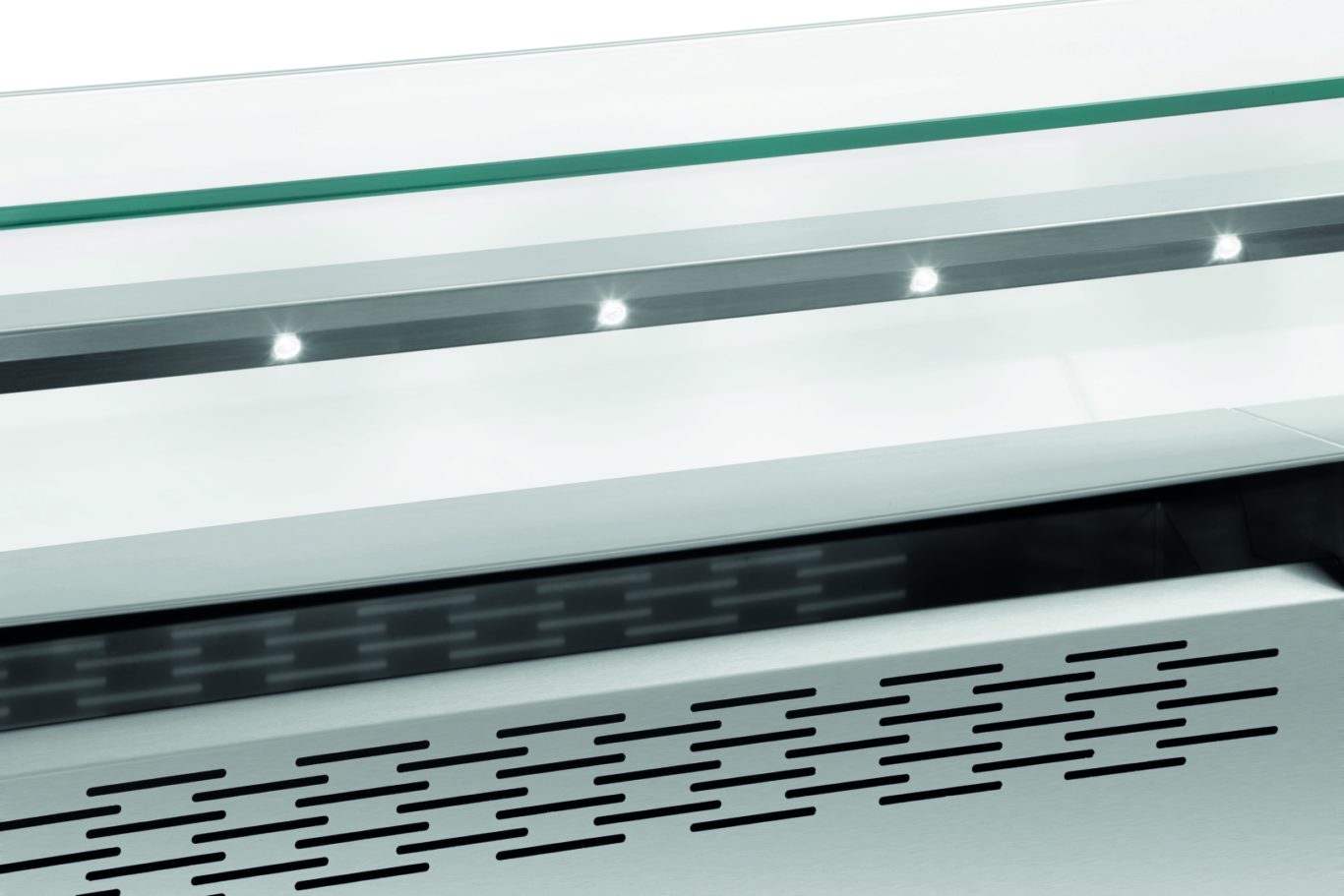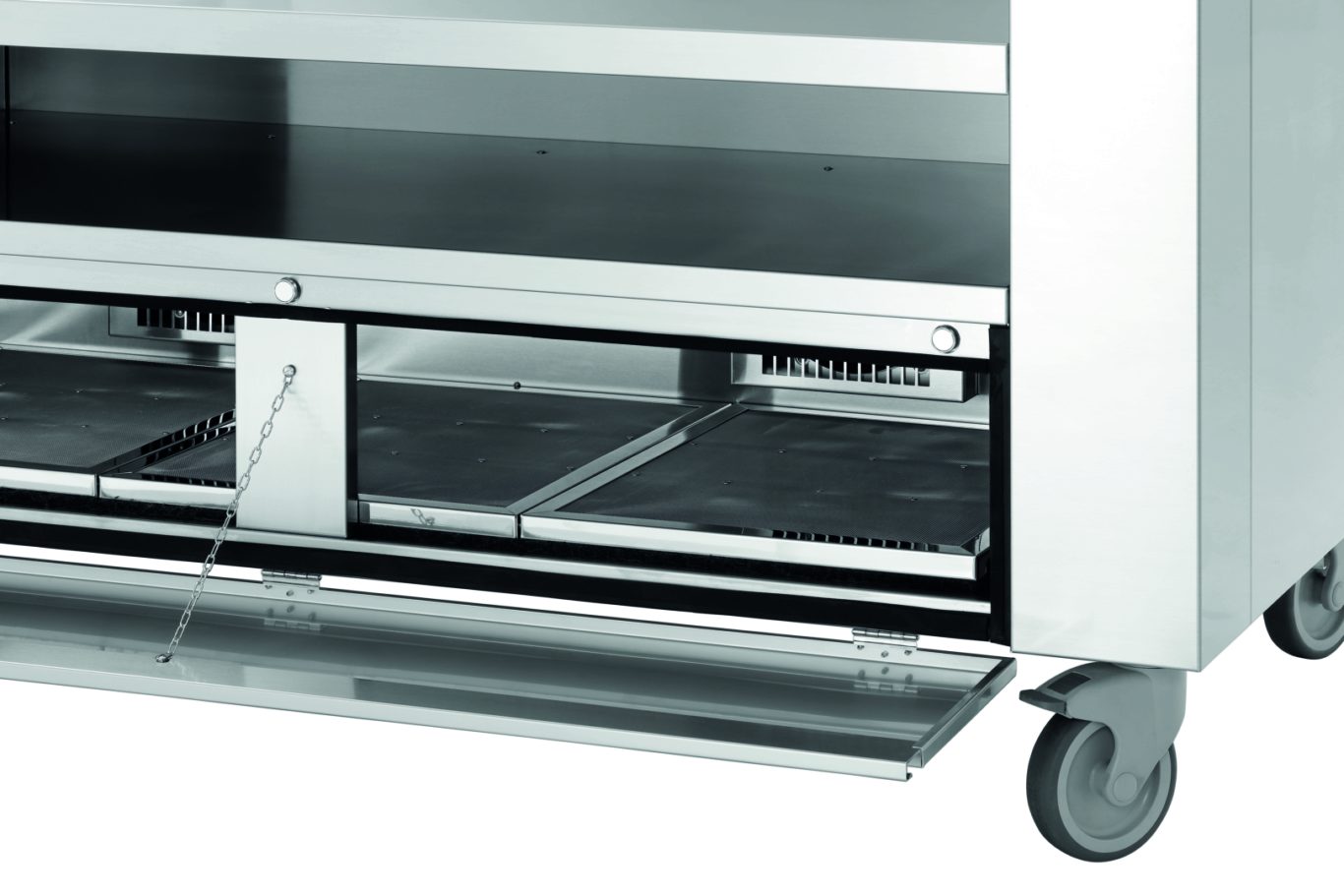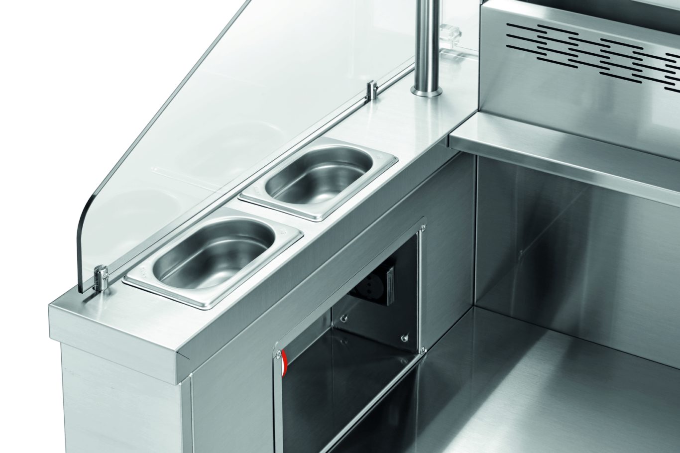 Оснащено с: Ящик для хранения под нишами настроек, размер: Ш 1 200 x Г 600 x В 150 мм ,4 емкости GN 1/9 GN, 100 мм глубина для масел, соусов, кухонных приборов ,Интегрированная вентиляция с лабиринтным фильтром