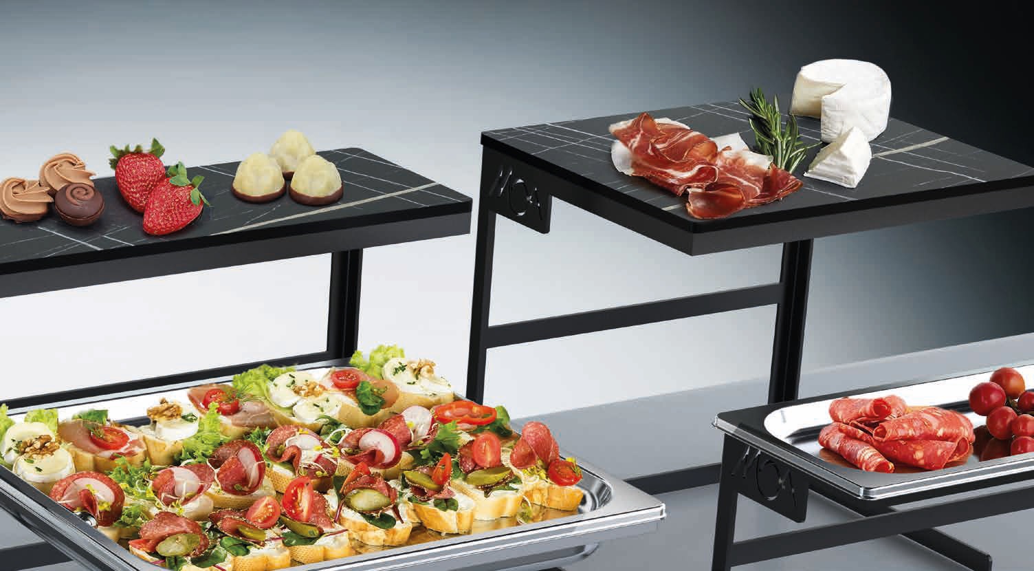 Стойка Minimal Line H-300 сталь черный лак c доской GN1/1 из смолы с мраморным эффектом 530x325x300мм