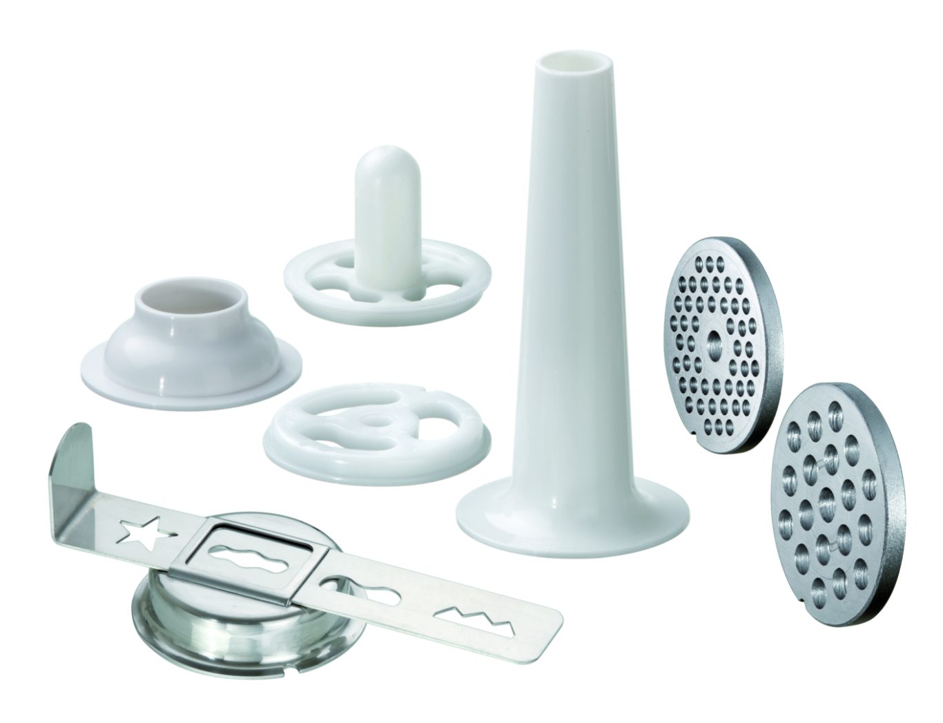 В комплекте: 1 нож из нержавеющeй стали, 4-лопастный ,1 насадка для кеббе (восточное блюдо) ,1 насадка для мелкого печенья ,1 уминатель ,1 рожок для фарширования колбас ,3 ножевые решетки (3 мм, 4,8 мм, 8 мм)