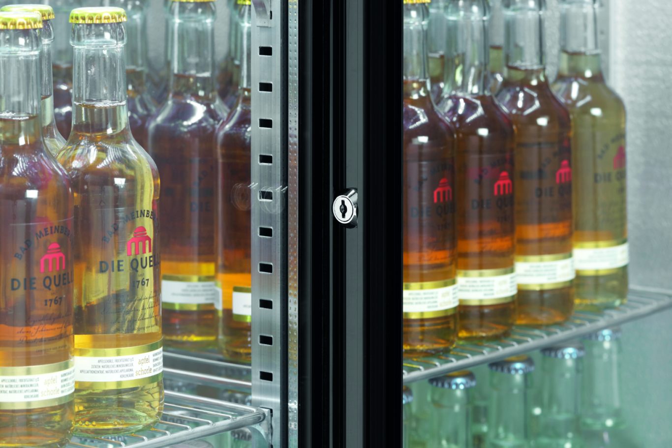 Бар-холодильник емкостью 176 л, с внутренним освещением и двумя самозакрывающимися сдвижными дверями с двойным остеклением надежно охлаждает напитки. Электронное управление с цифровым дисплеем позволяет точно установить желаемую температуру.