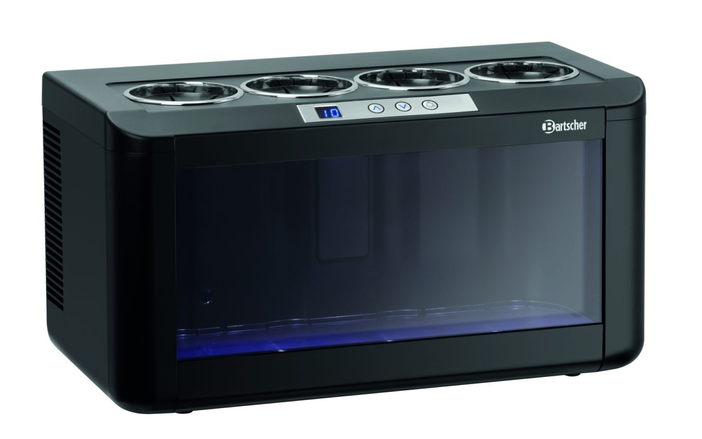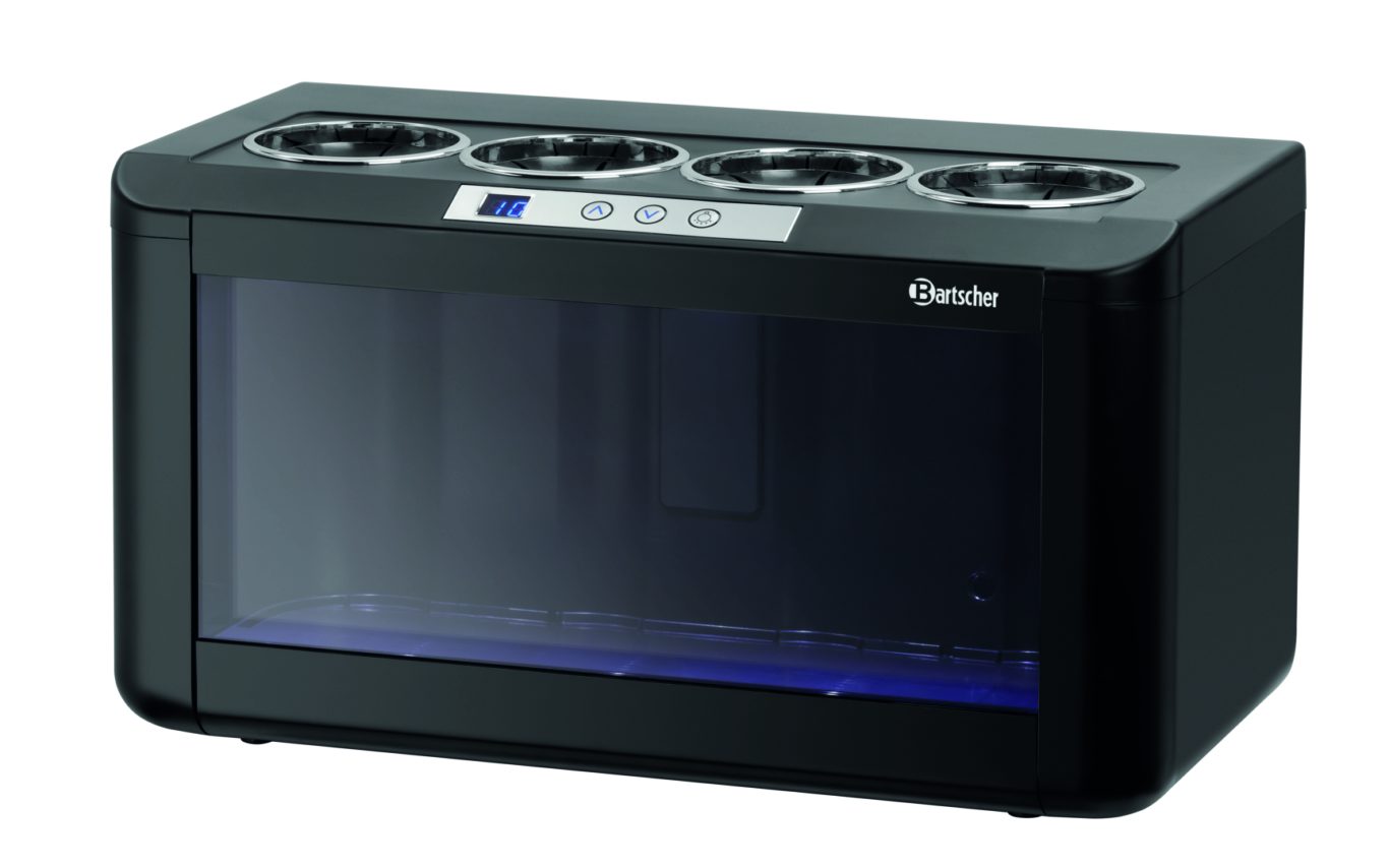 Компактный охладитель вина со светодиодной подсветкой в элегантном исполнении. Можно охлаждать 4 бутылки белого, розового или красного вина в рамках одного температурного режима у стойки для продажи спиртных напитков на разлив, у буфета или барной стойки, либо на дегустации вина; при этом охладитель выглядит очень эстетично.