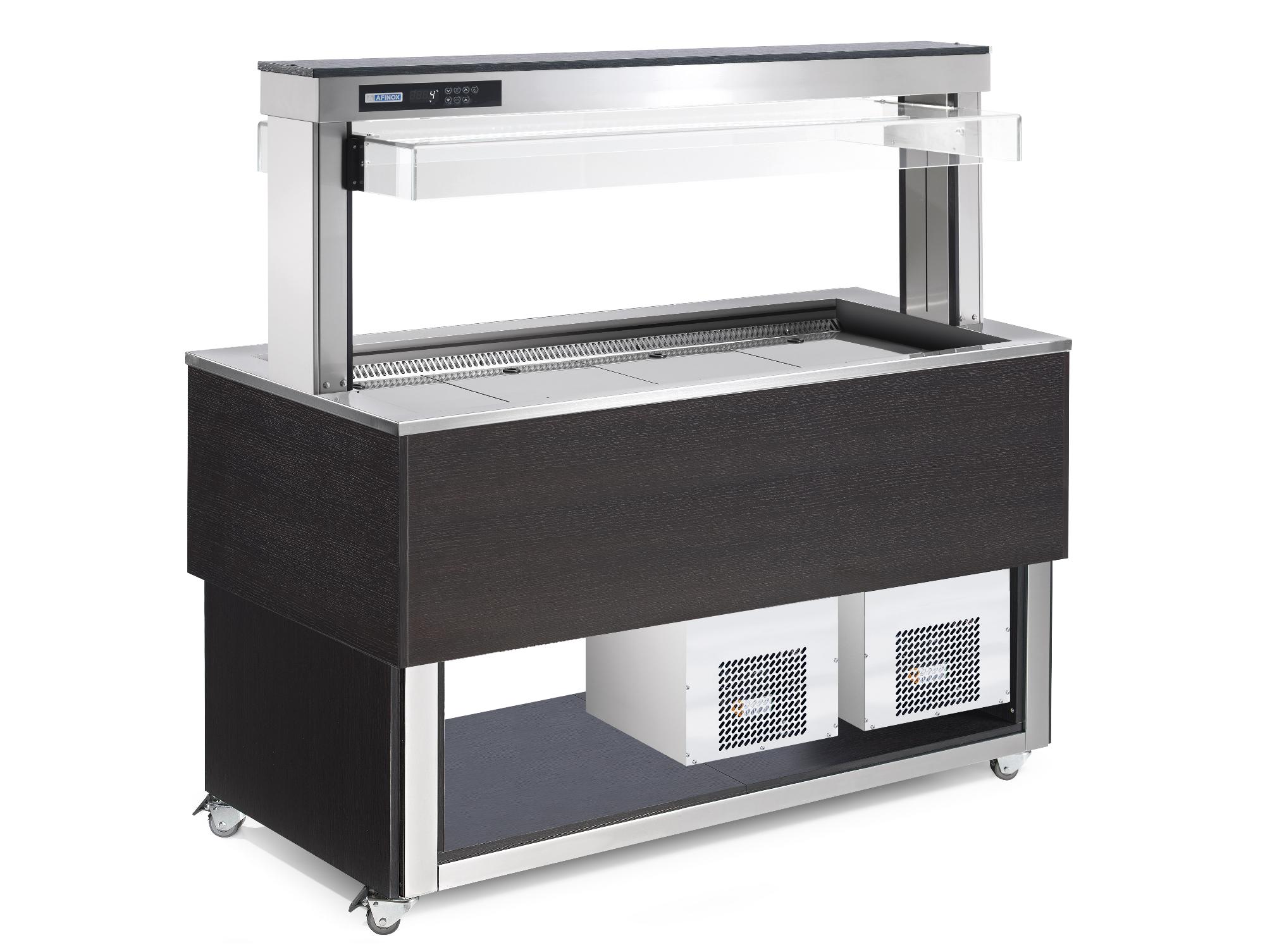 Охлаждающий шведский стол с подачей воздуха на ванны, прочным каркасом из хромированной стали на колесах, покрытием из ламината и надстройкой из стекла со светодиодной подсветкой.