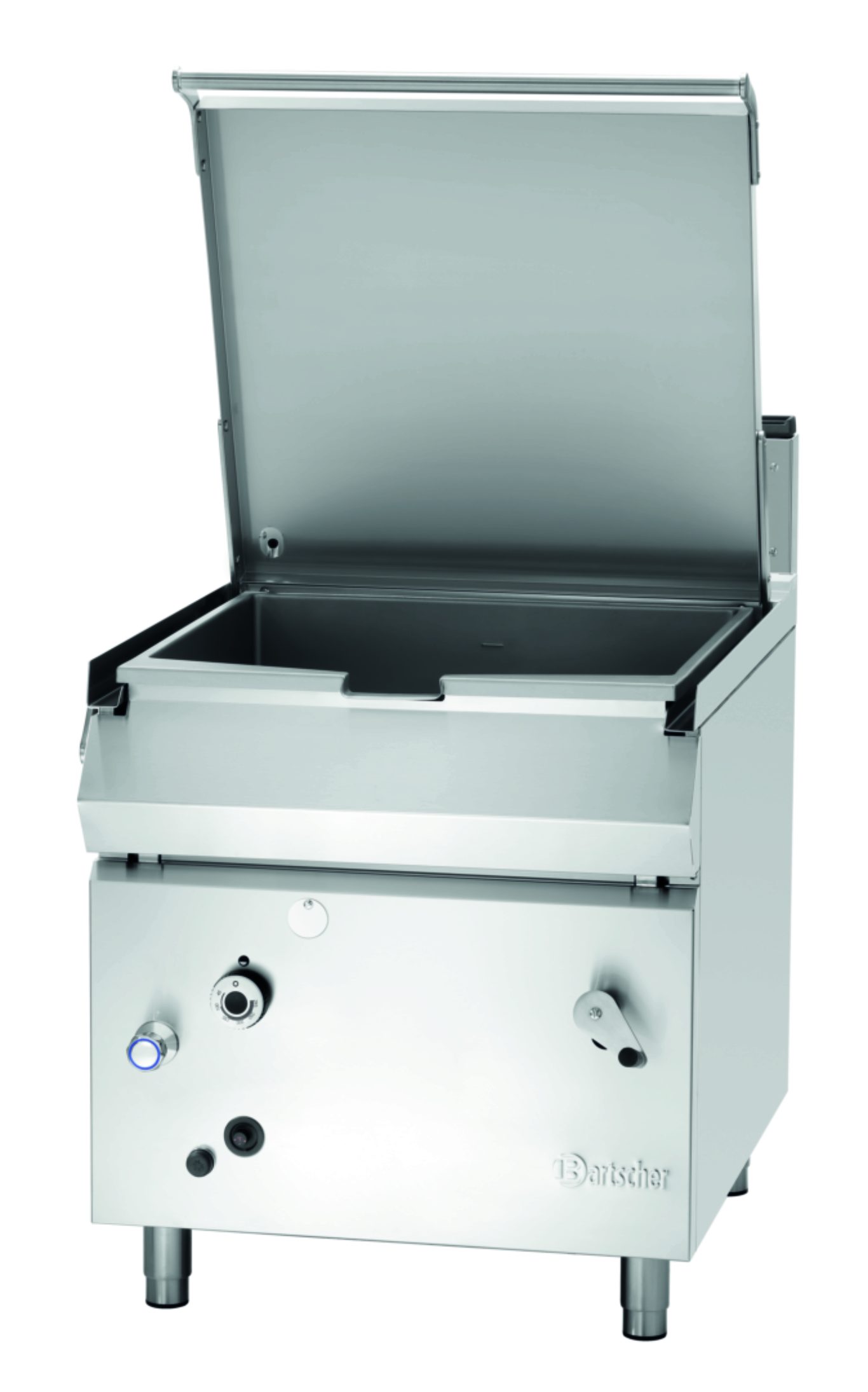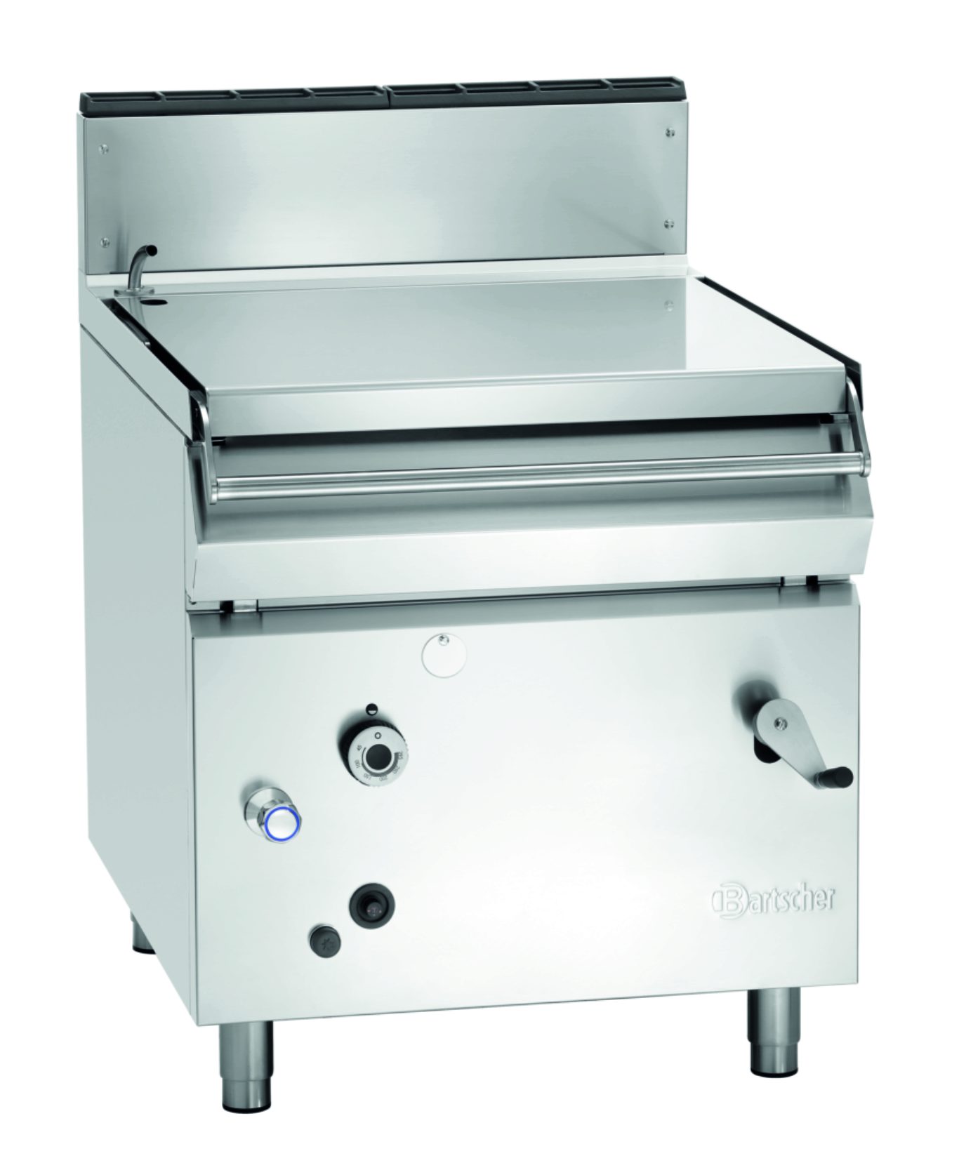 Опрокидывающаяся сковорода серии 900 в известном высоким качеством исполнении из высокосортной стали. Горшок полностью из высокосортной стали, объем до 70 литров. Газовая модель с ручным опрокидывающим устройством оснащена питающим водяным краном и рассчитана на подключение холодной или горячей воды.