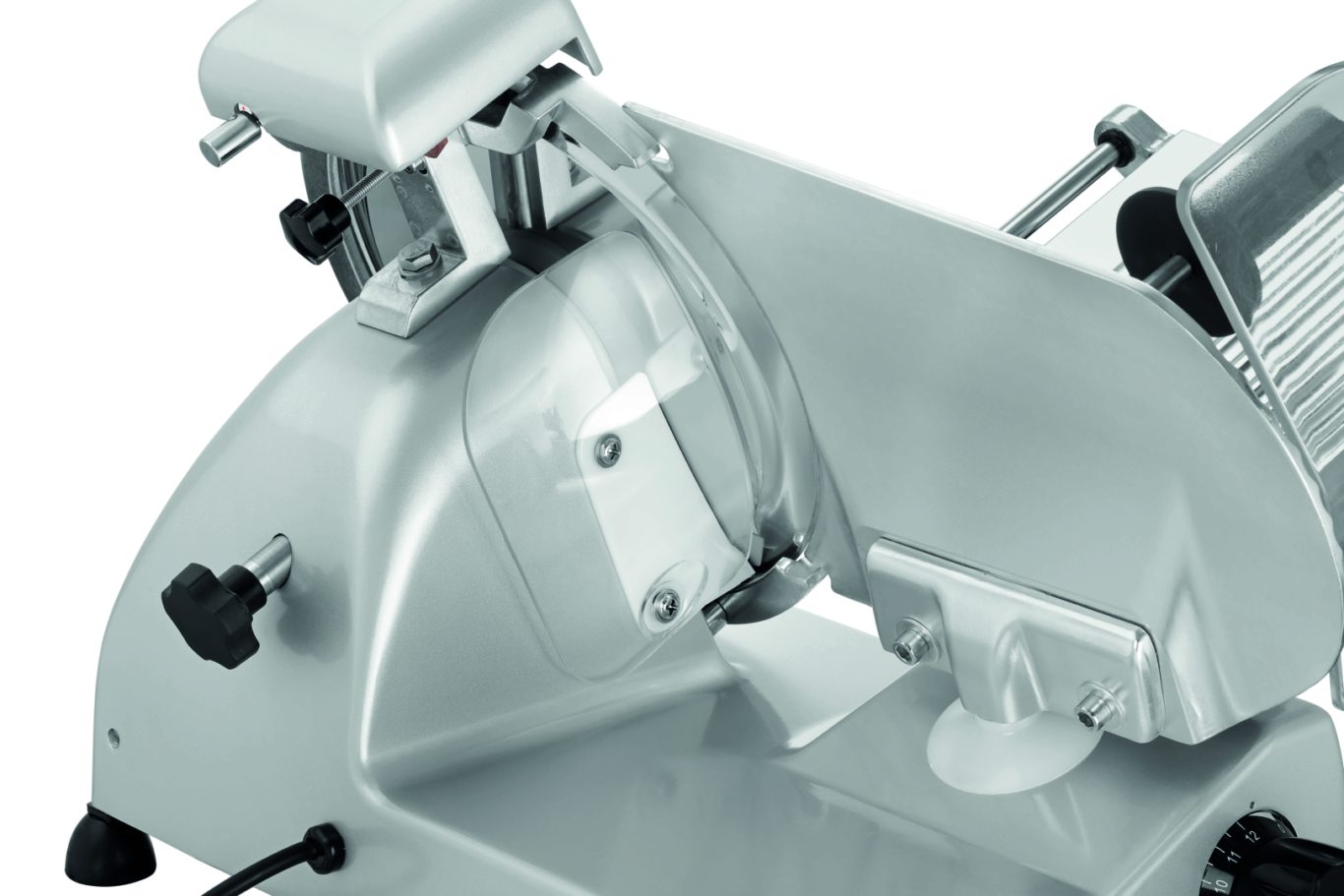 Исполнение улучшенного слайсера с ножом диаметром 195 мм впечатляет своими техническими характеристиками. Высокопроизводительный слайсер снабжён прижимным механизмом, заточным устройством, направляющей наклонной кареткой, а также двойной защитой ножа и магнитным выключателем для обеспечения безопасности.