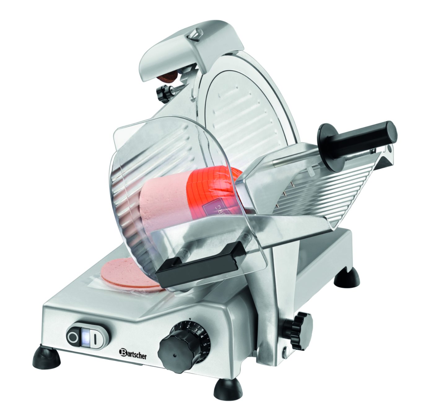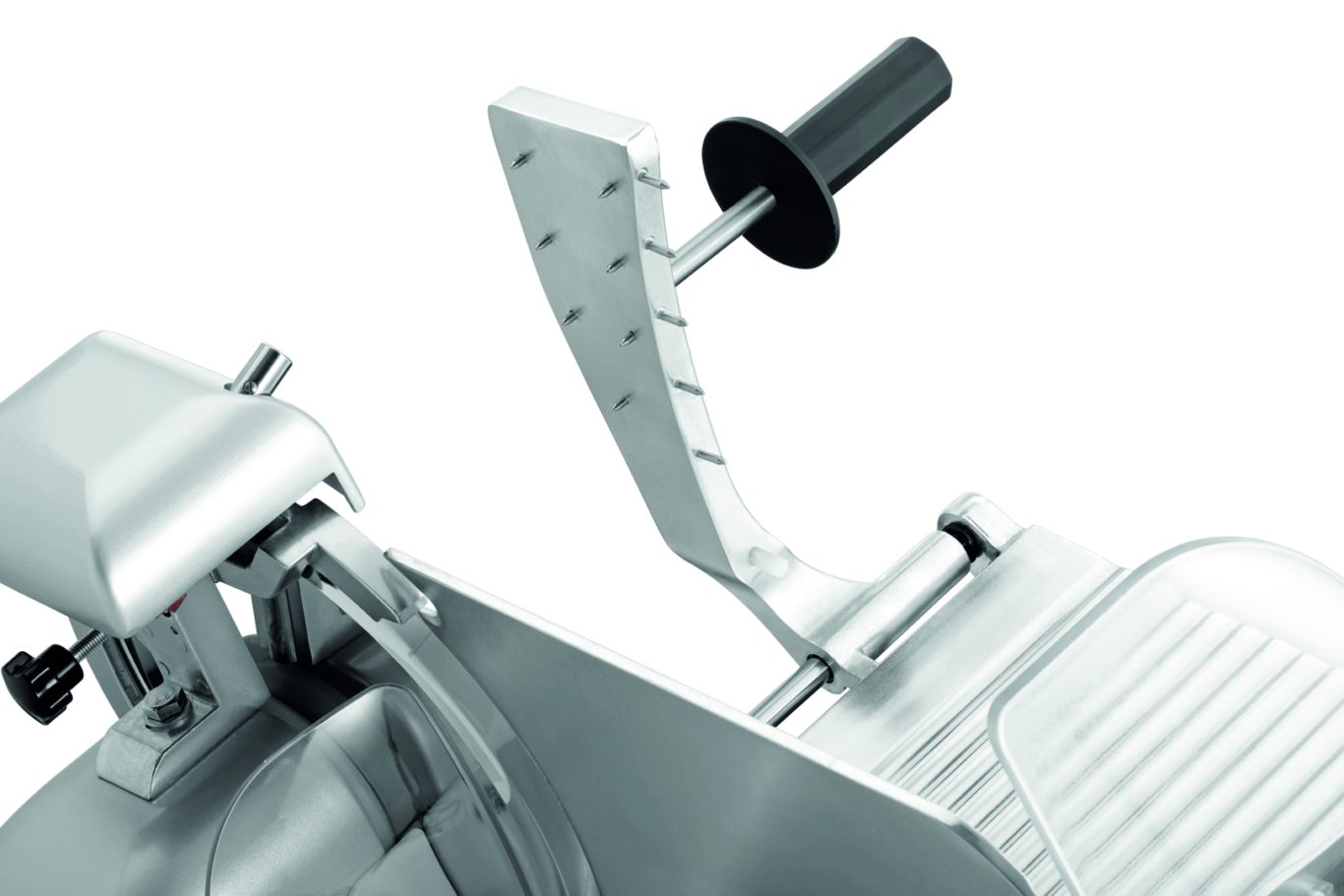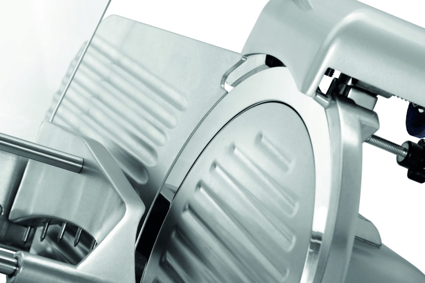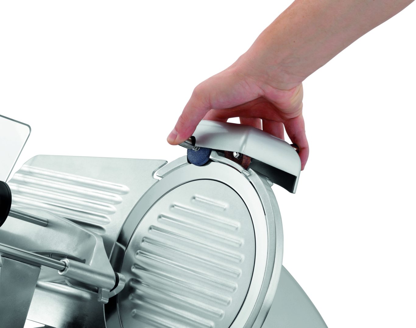 Исполнение улучшенного слайсера с ножом диаметром 250 мм впечатляет своими техническими характеристиками. Высокопроизводительный слайсер снабжён прижимным механизмом, заточным устройством, направляющей наклонной кареткой, а также двойной защитой ножа и магнитным выключателем для обеспечения безопасности.