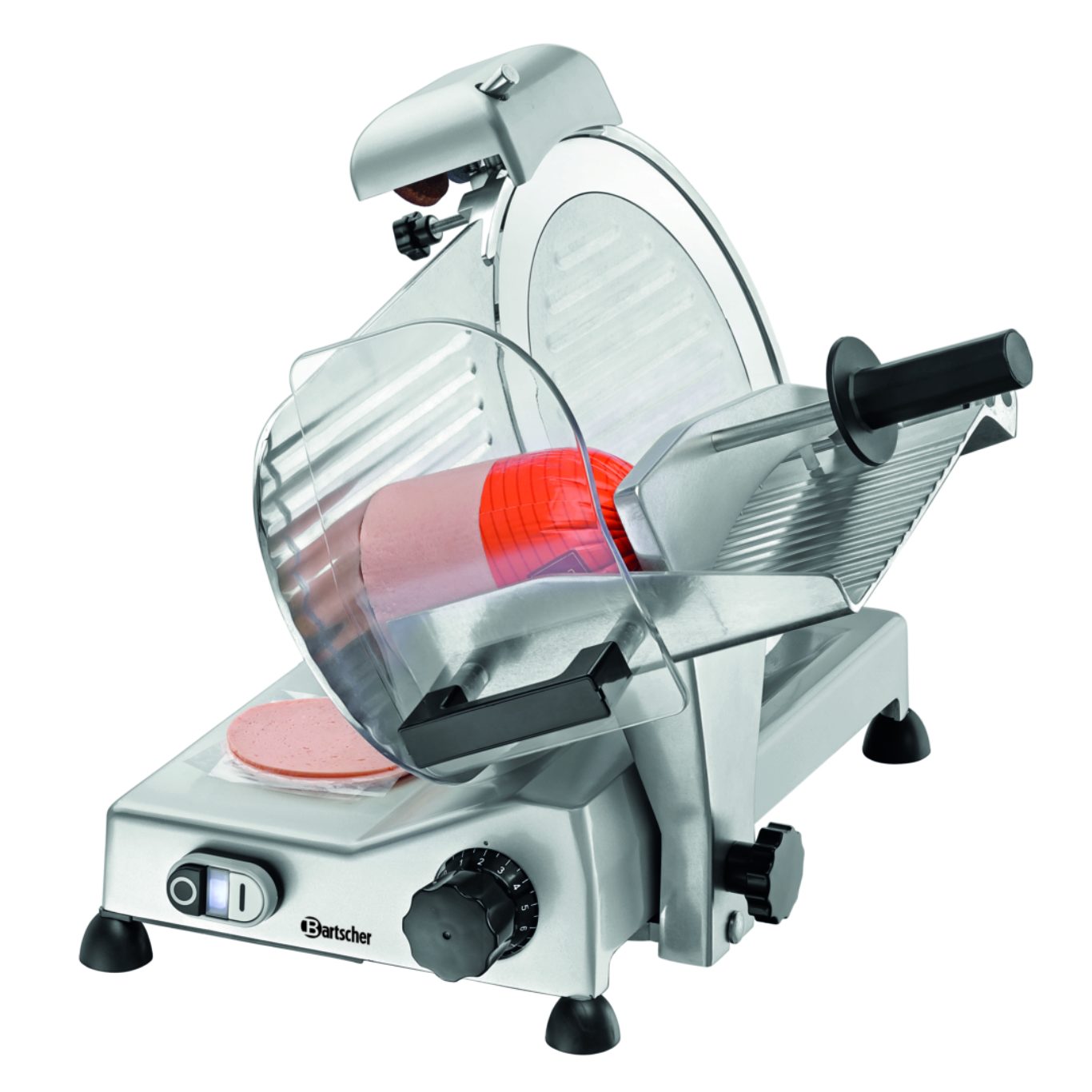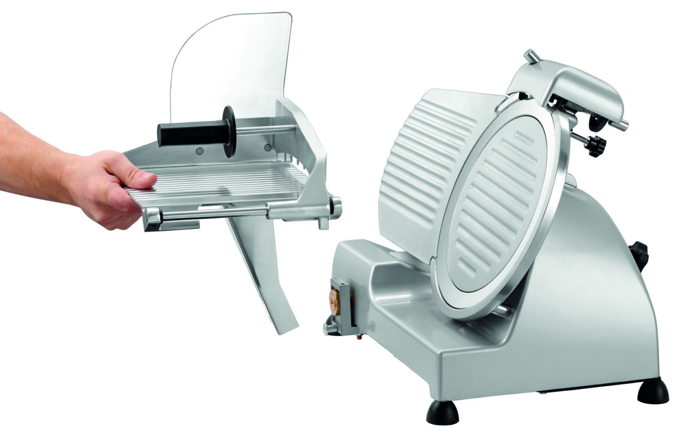 Исполнение улучшенного слайсера с ножом диаметром 275 мм впечатляет своими техническими характеристиками. Высокопроизводительный слайсер снабжён прижимным механизмом, заточным устройством, направляющей наклонной кареткой, а также двойной защитой ножа и магнитным выключателем для обеспечения безопасности.