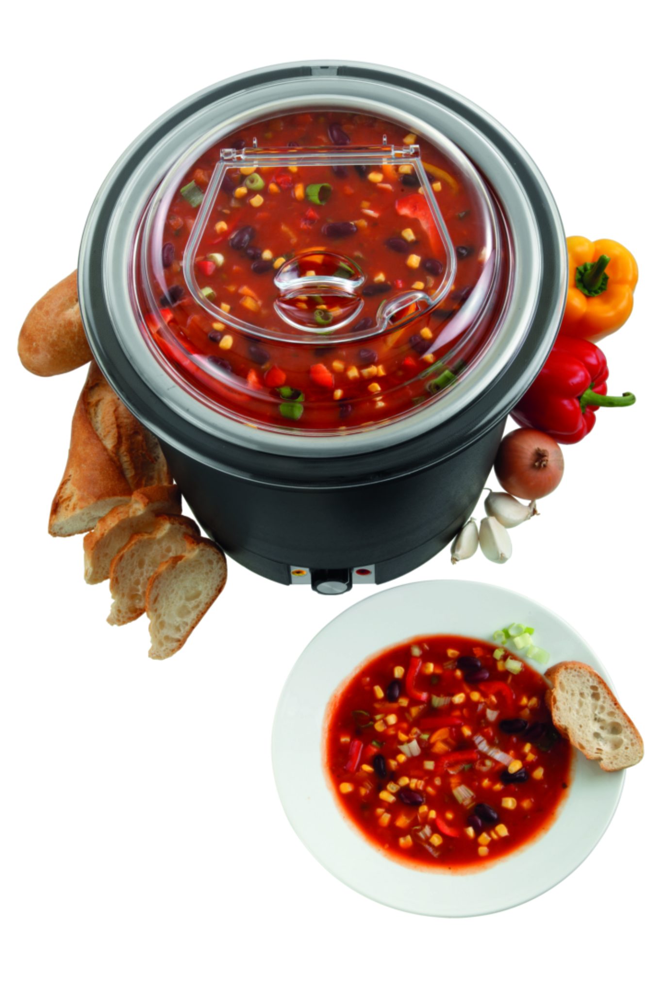 Прозрачная крышка из поликарбоната позволяет в любой момент проверить содержимое супницы. Уровень супа или соуса проверяется просто и без ненужных потерь тепла.