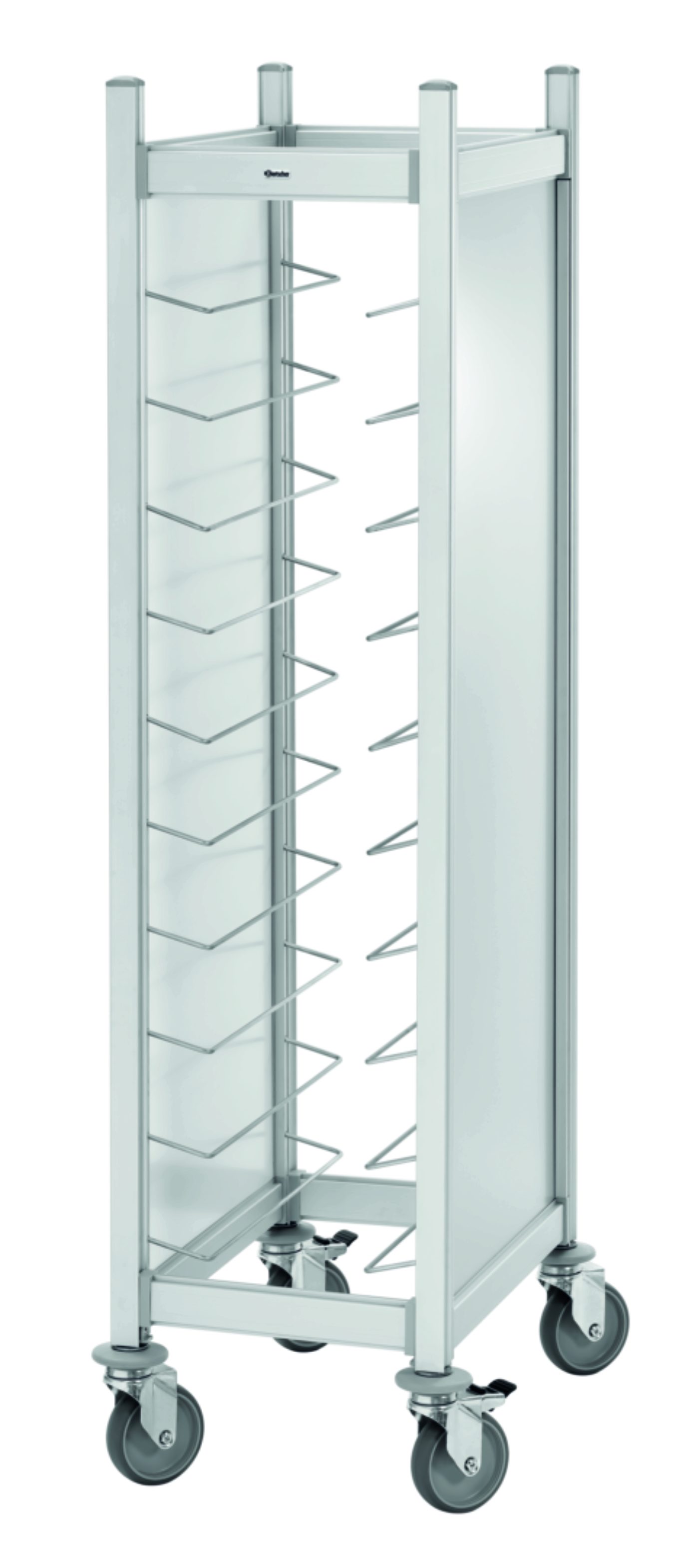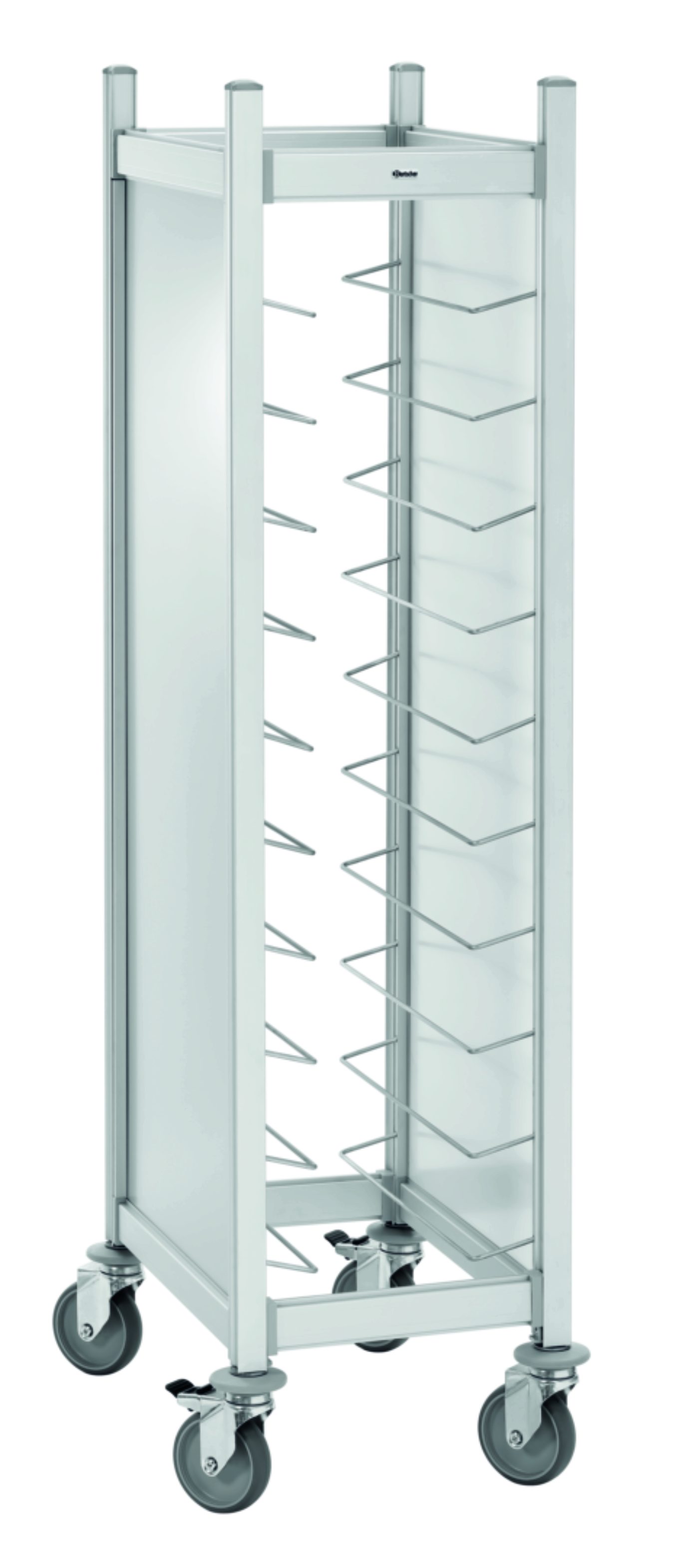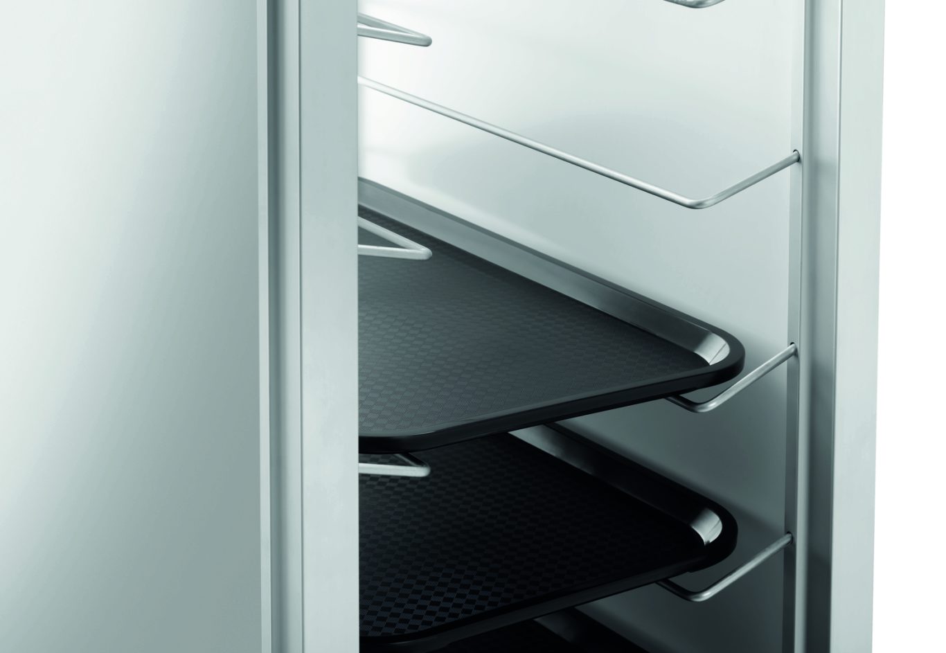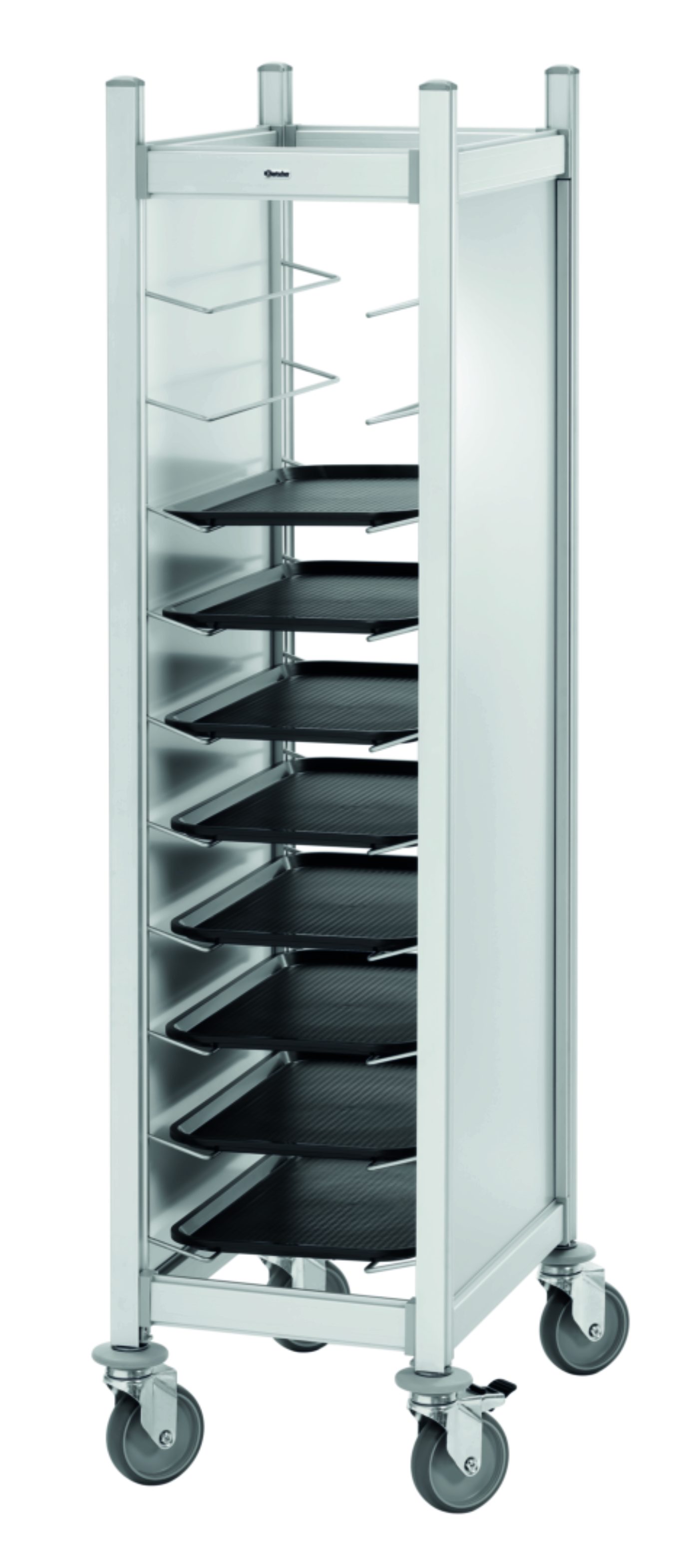 Прочная тележка для уборки посуды впечатляет благодаря своей высокой грузоподъемности и большим вставкам формата гастроемкости GN 1/1.
