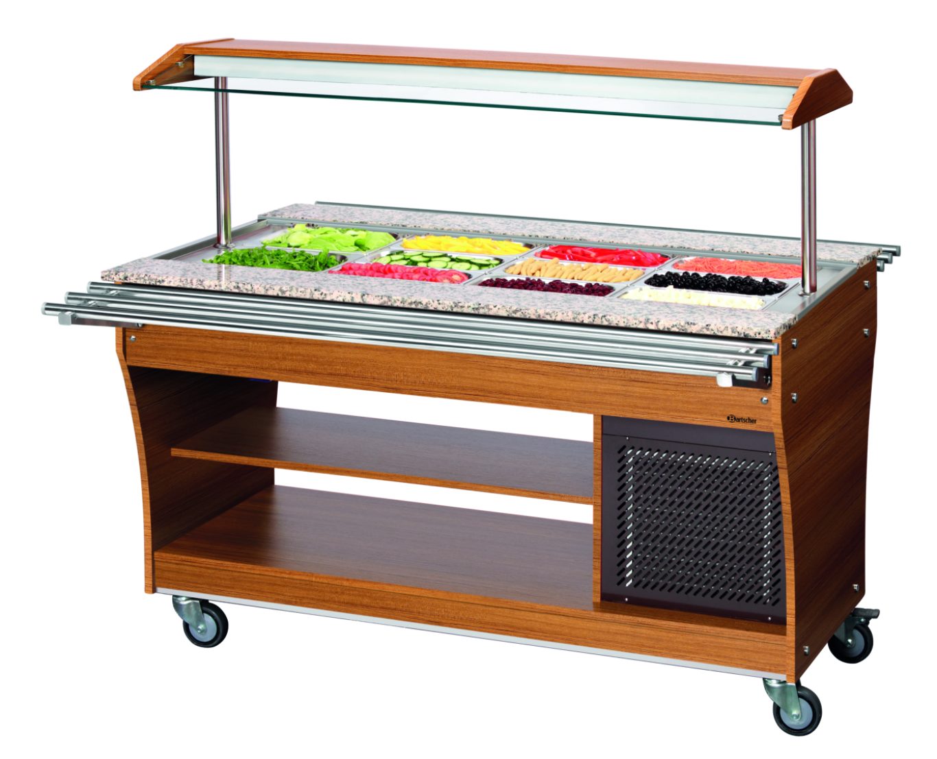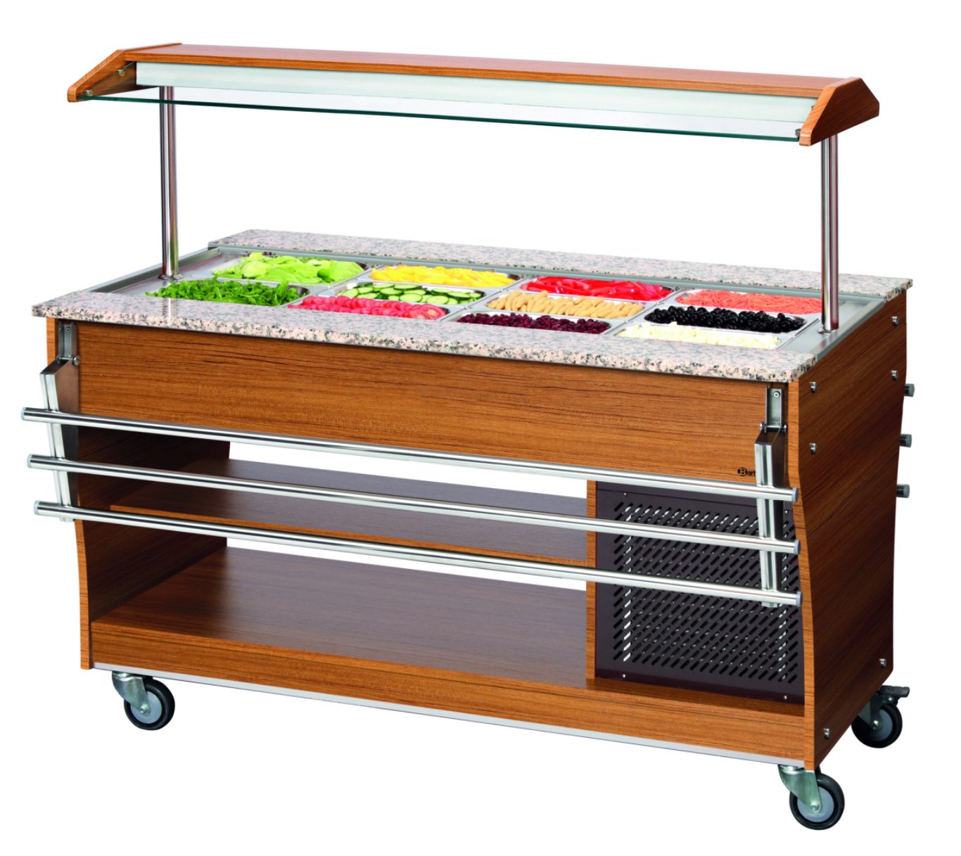 Буфетная тележка оптимально оснащена встроенным освещением, защитой от брызг, функцией хранения и колесиками для удобной транспортировки.